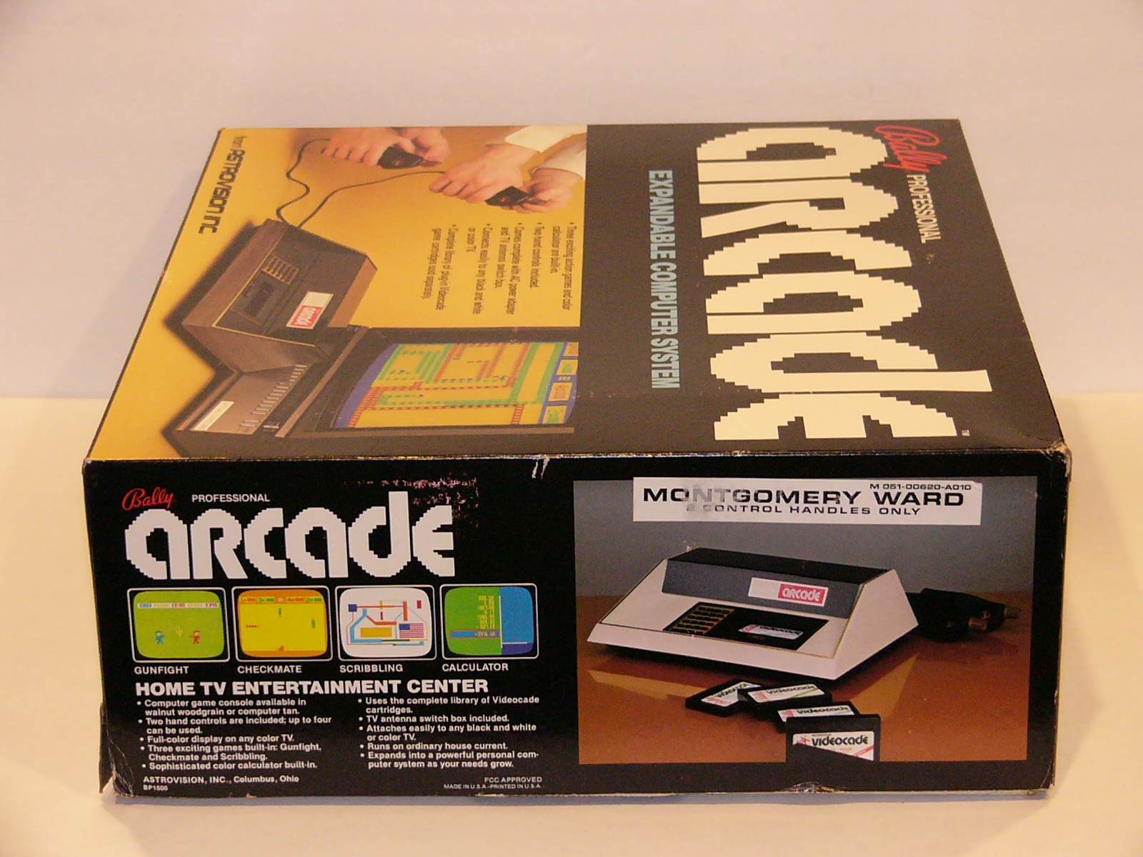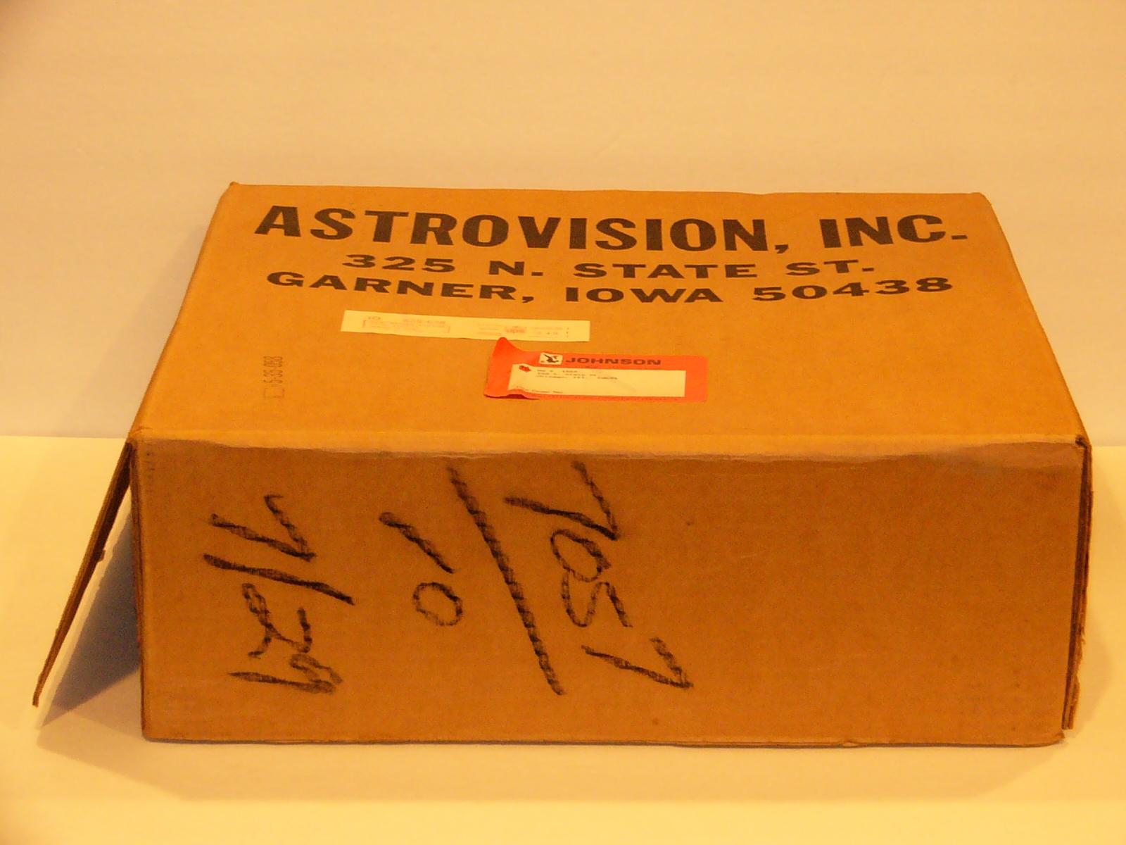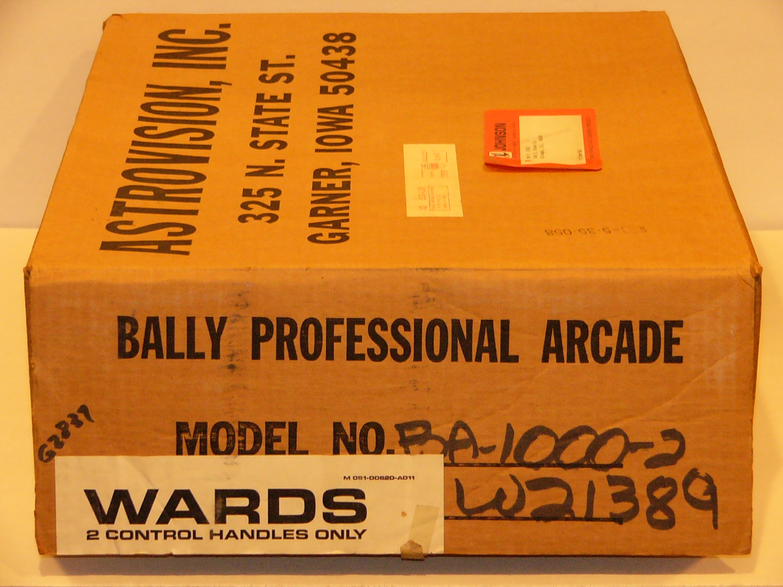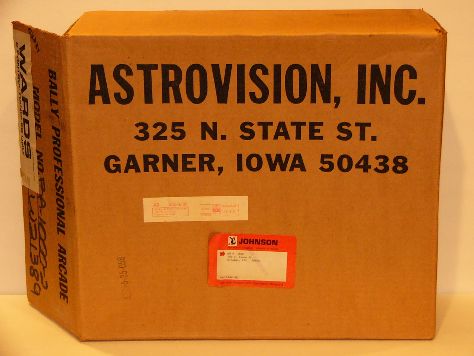 I recently purchased a nearly complete-in-box white Astrocade on eBay. In fact, it is nearly complete in two boxes because the shipping box was included, something not mentioned in the auction description. This particular unit was sold at the Montgomery Ward department store. It is packaged in the Astrovision box that appeared between the original Bally box and the final Astrocade, Inc. box. The white unit is displayed in a photo on the right side of the box, along with a Montgomery Ward sticker. The shipping date was July 28, 1981.